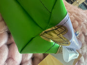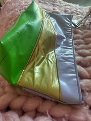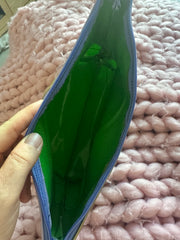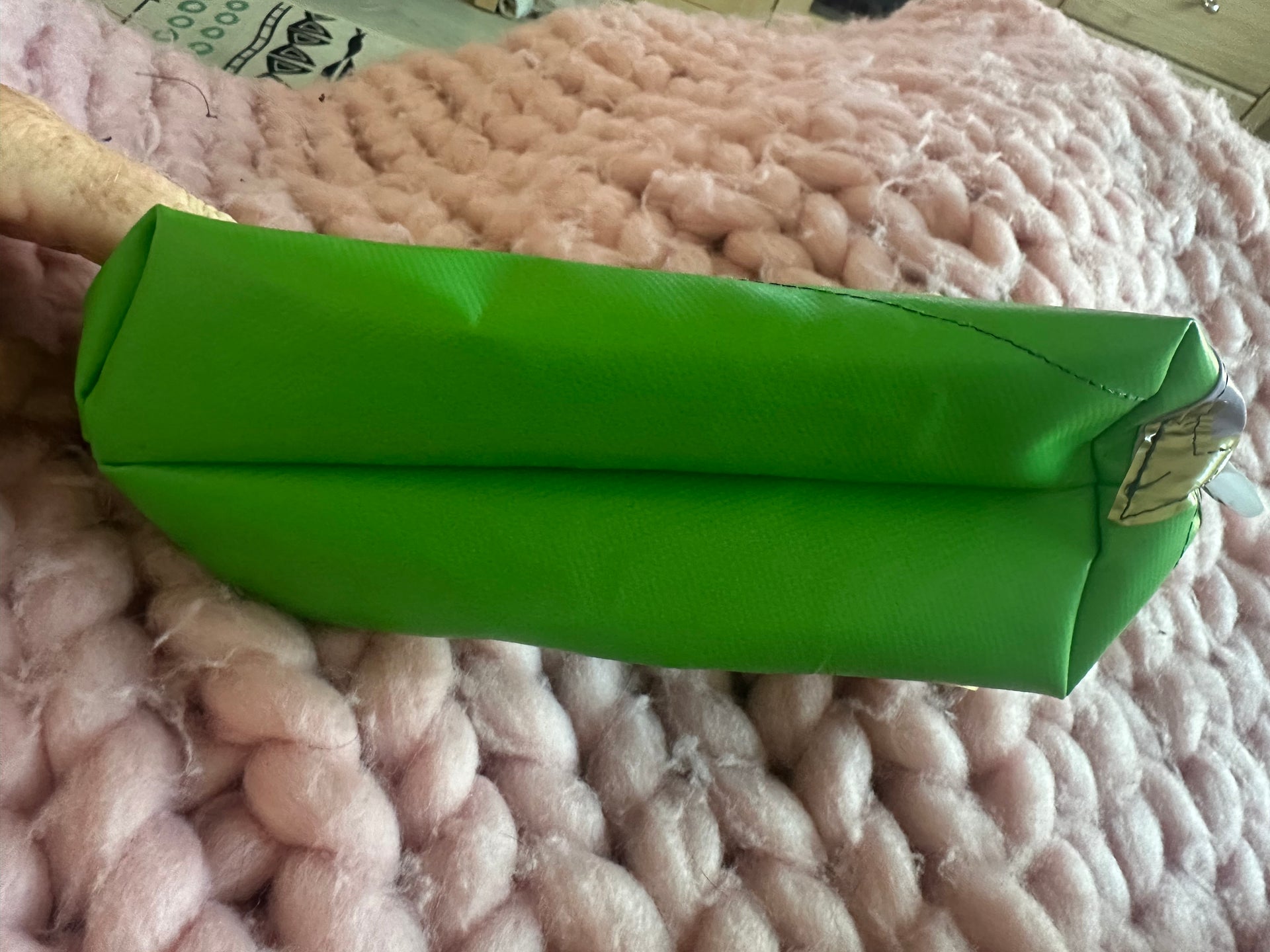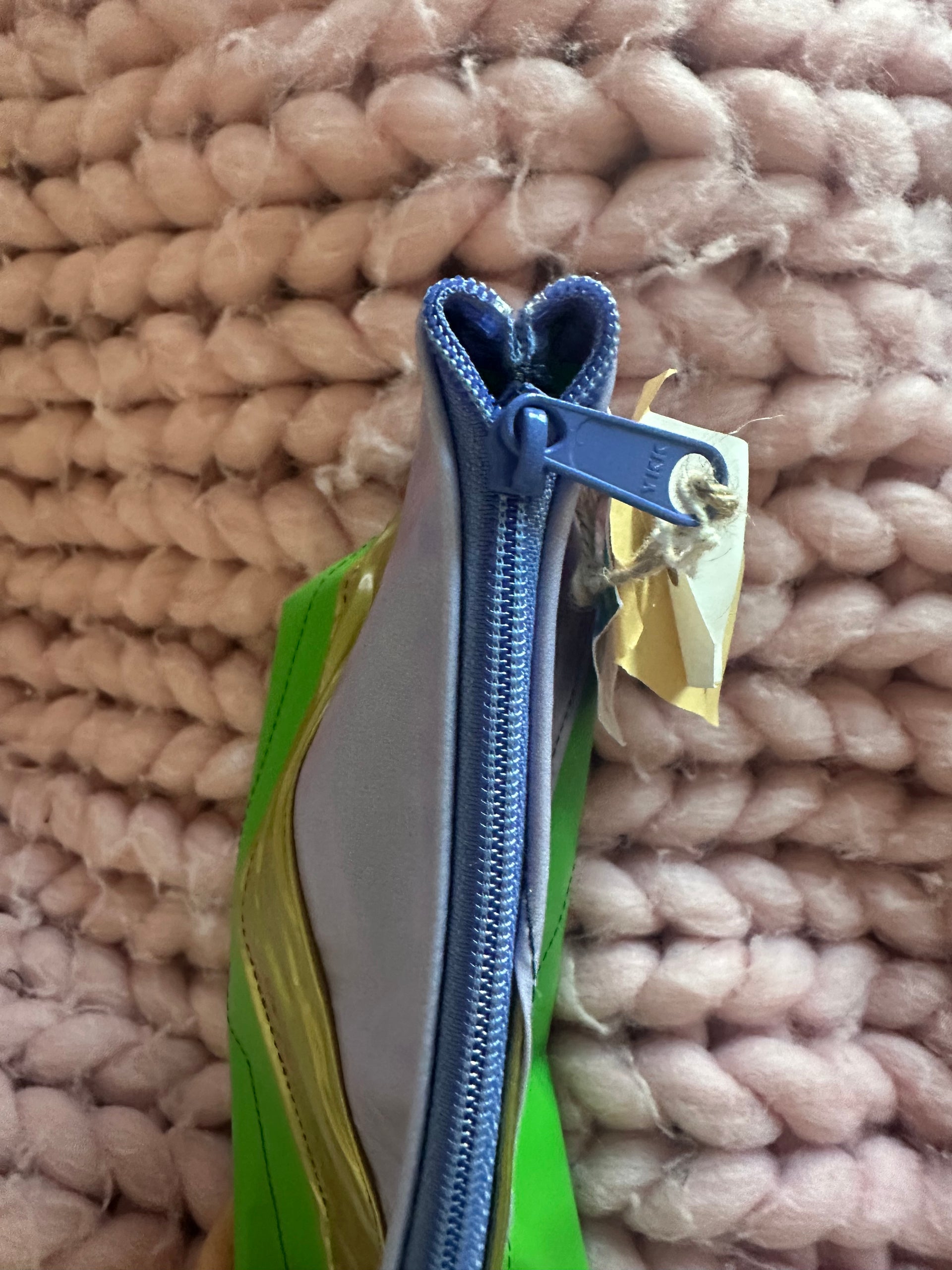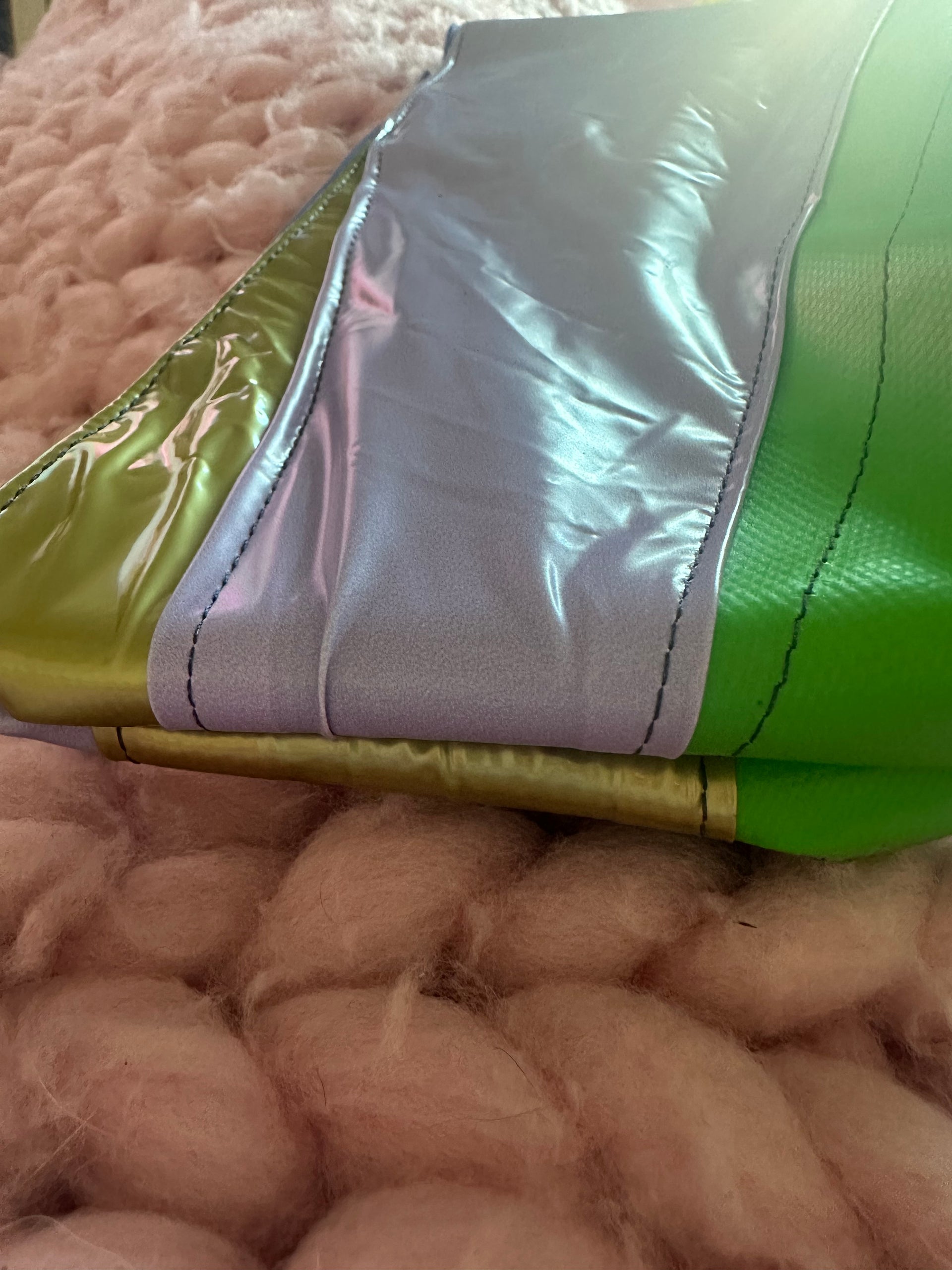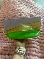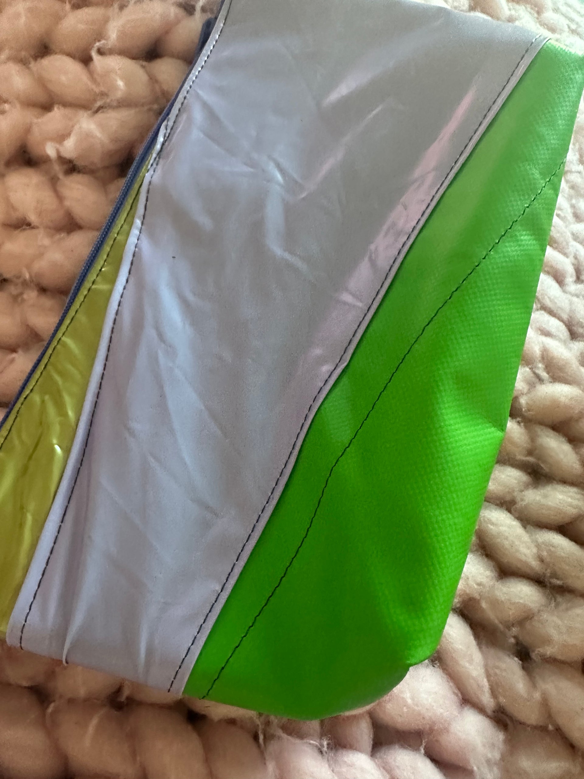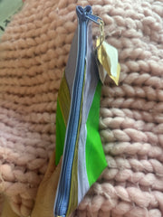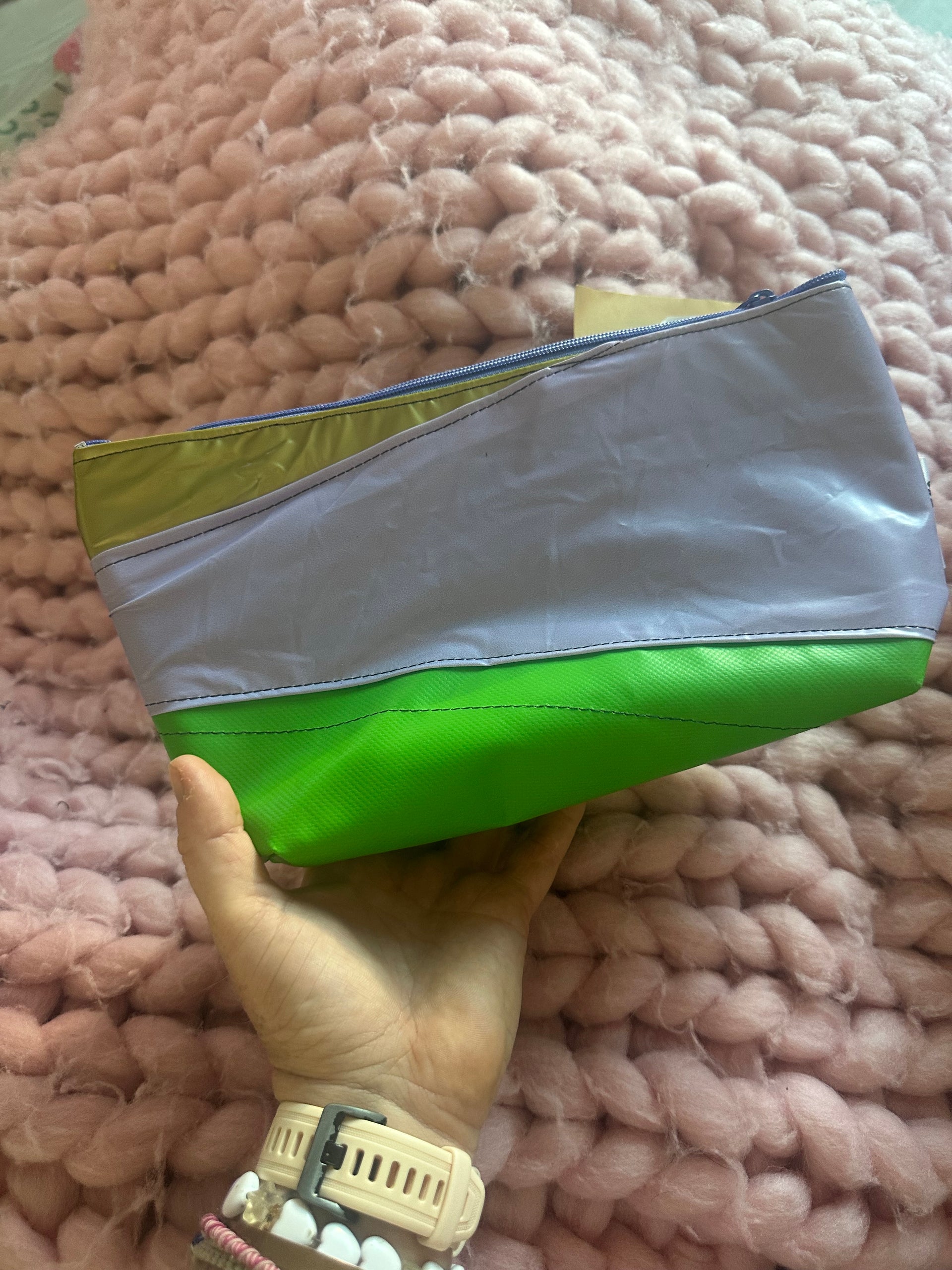 Here is a handmade zipped pouch with a boxy base, made mostly from off cuts of inflatables the green material being thicker. These cannot easily be recycled. Shapes have been stitched on top including at the base, a small love heart shape. This item has been handmade in Cornwall.