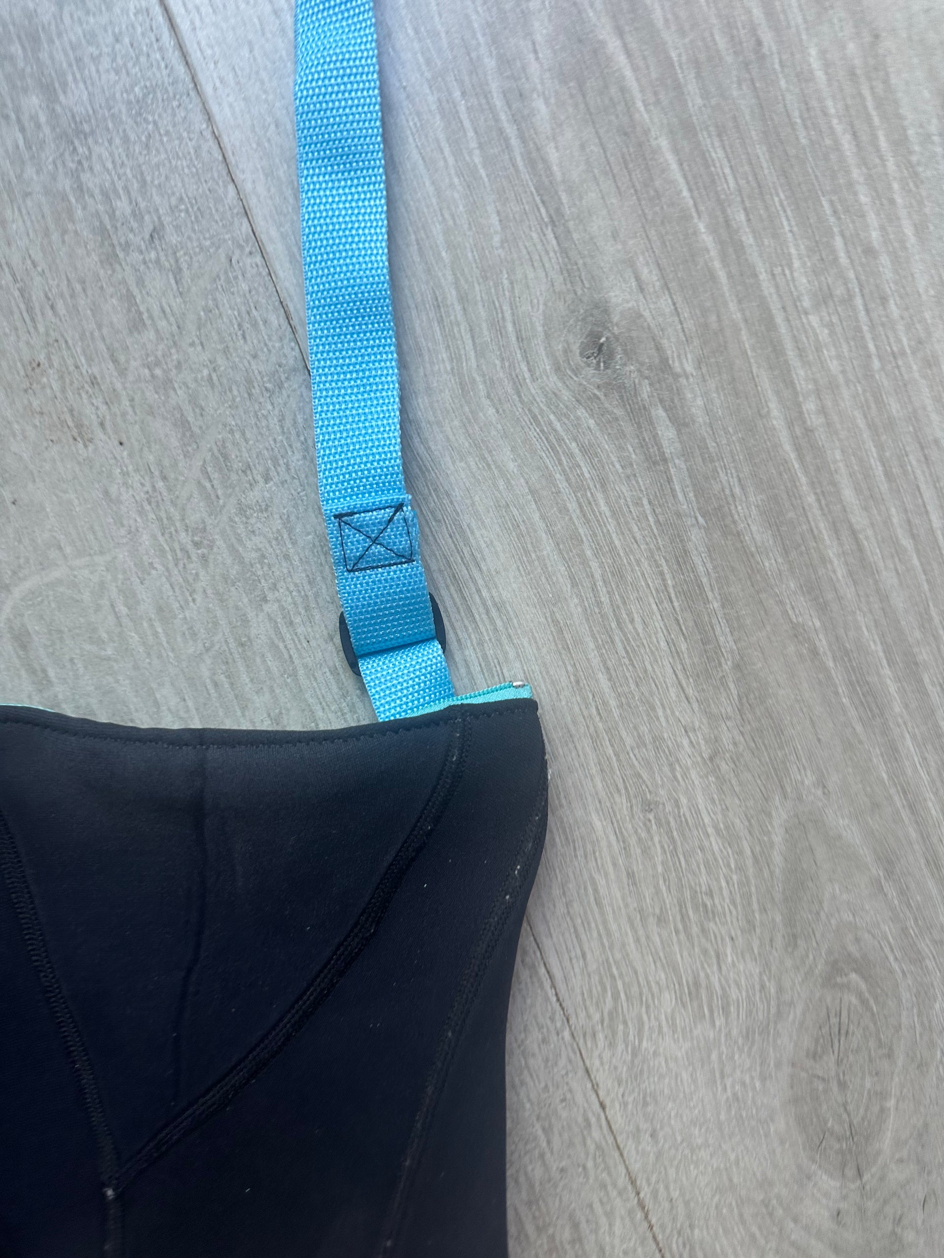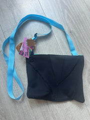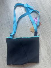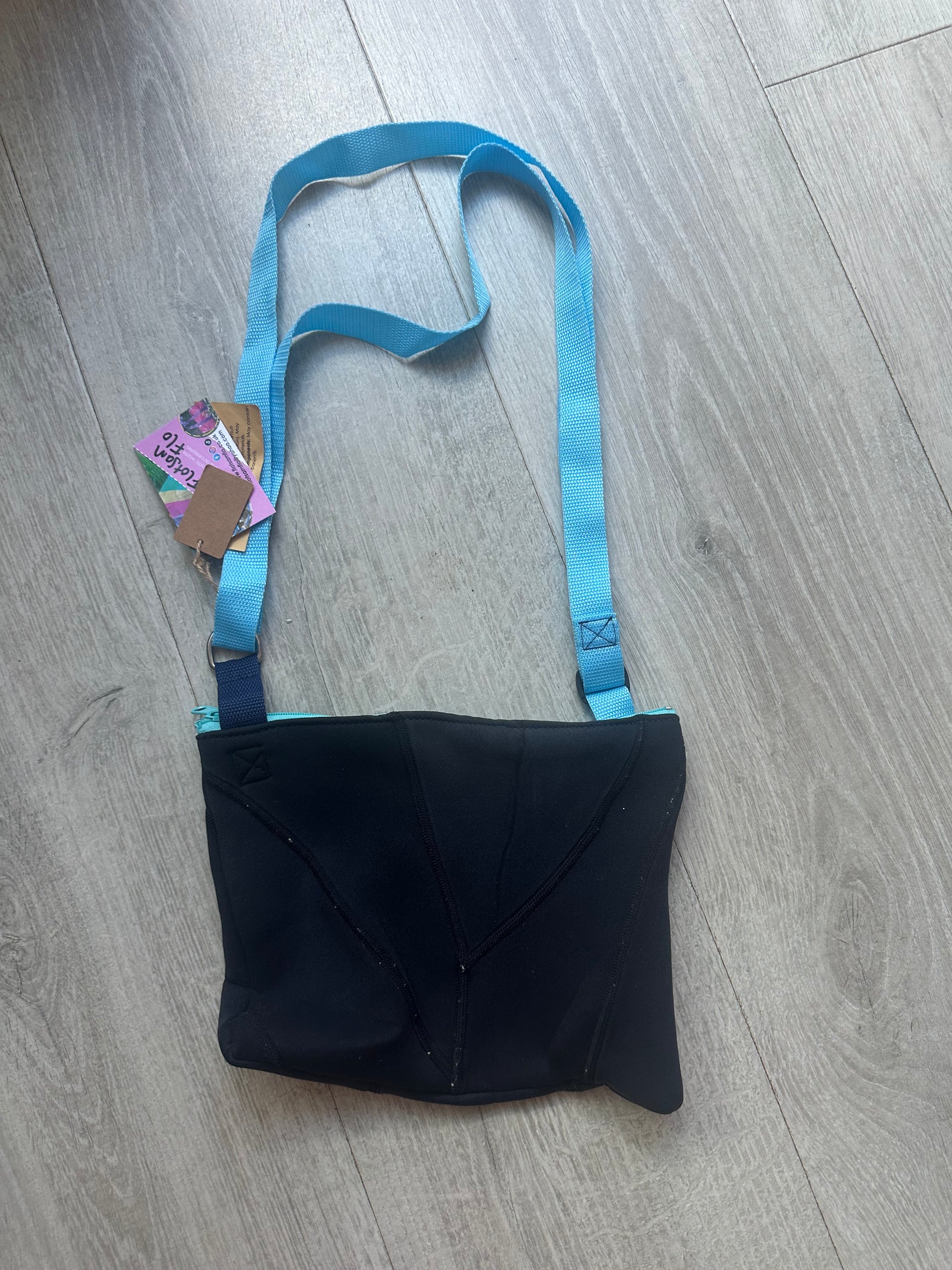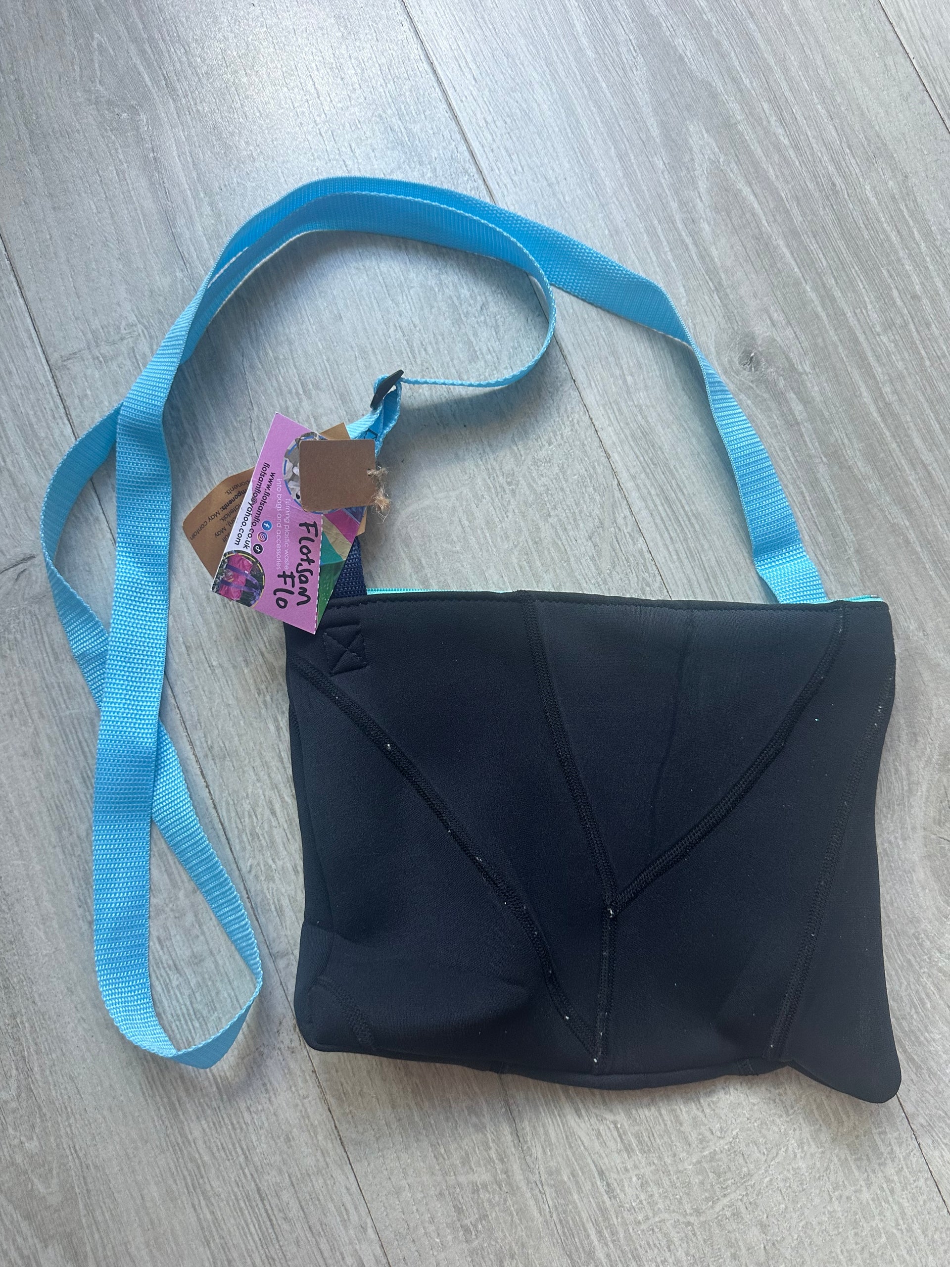 Here is a smaller cross Body Bag made mostly from a broken Wetsuit that are very difficult to recycle. Wetsuit material is tricky to sew so items are often a little wonky, but this is the beauty of this material. This is a smaller type cross body bag.