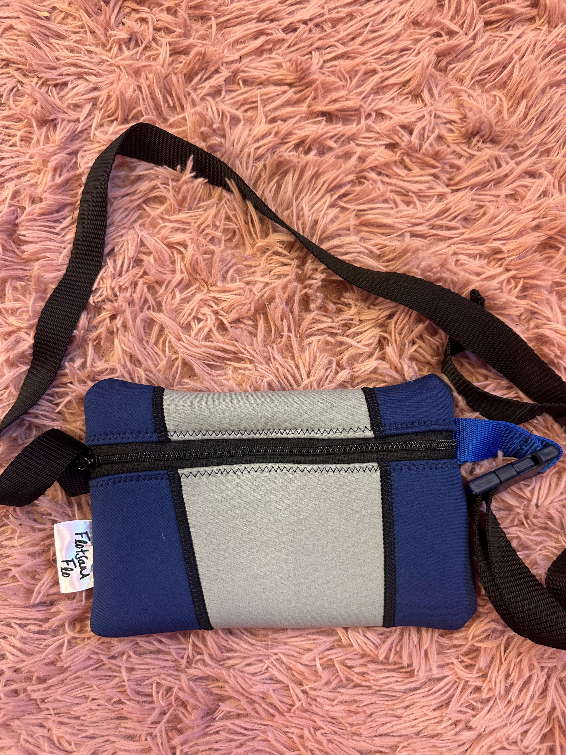 The keeper of the strap is made from a punctured inner tube. The waist bag has a zip that measures 8 1/2” long approx and this is also the length of the bum bag. The height of the waist bag is 5 1/2” approx. The strap is adjustable and can neatly be tucked in with the innertube keeper on the webbing strap. The webbing strap that fits around the waist goes up to 55” when the strap is at its longest. However the strap is adjustable so goes much smaller also. Made in Cornwall.  As this material has been made from a broken wetsuit there may be some markings or signs of wear. All wetsuits are washed before I use them but I don't like using harsh chemicals, but these marks are the beauty of using upcycled materials.