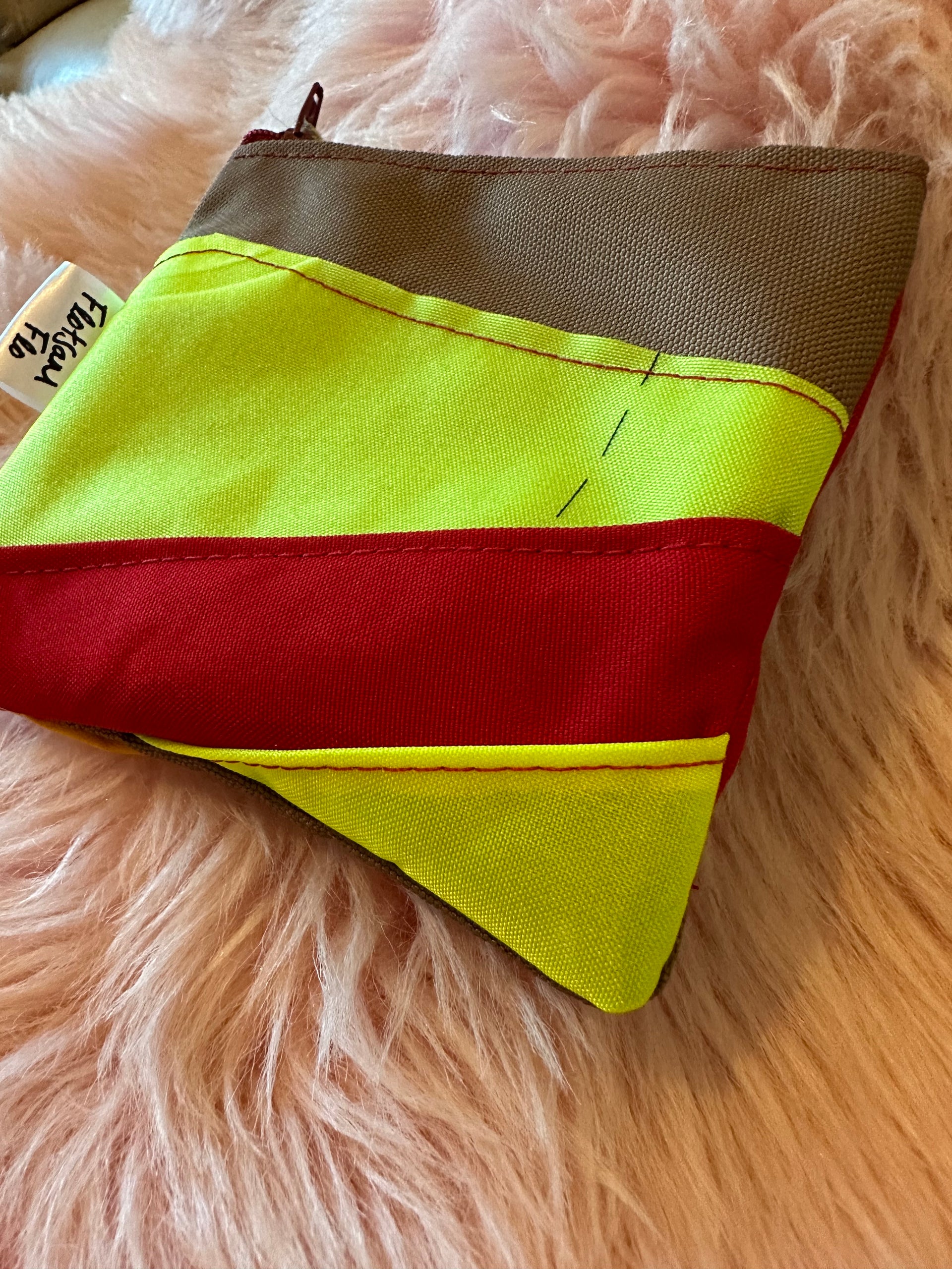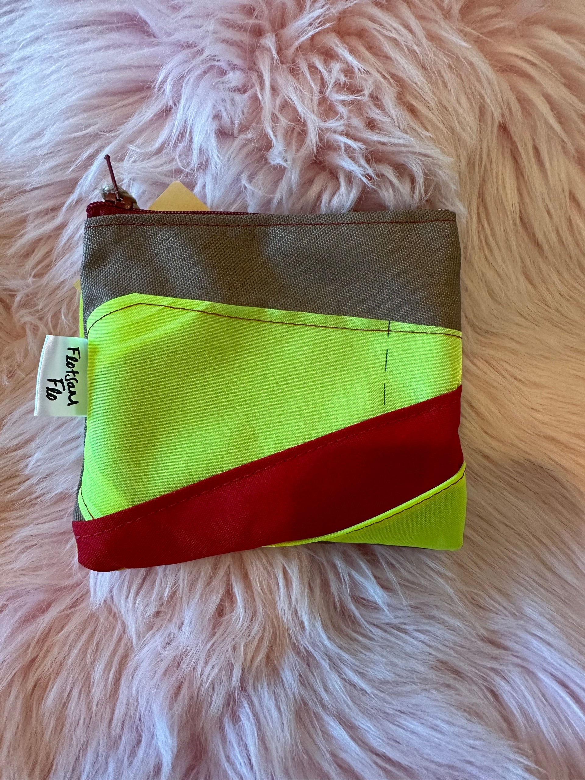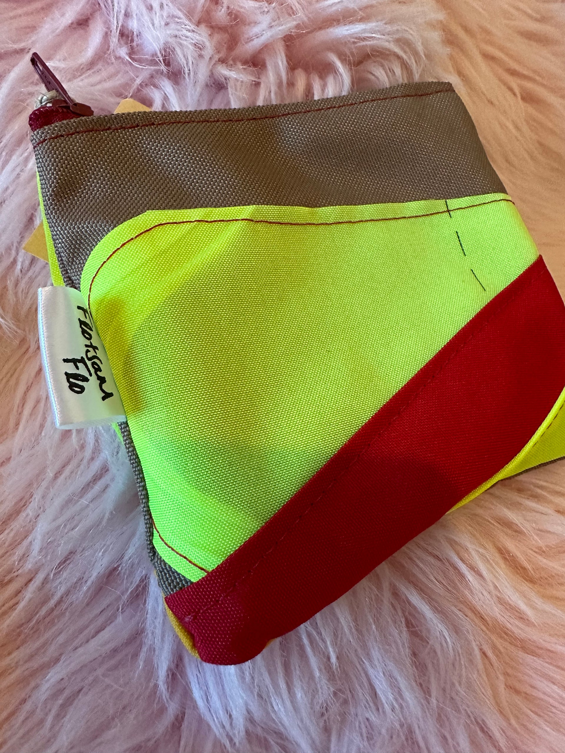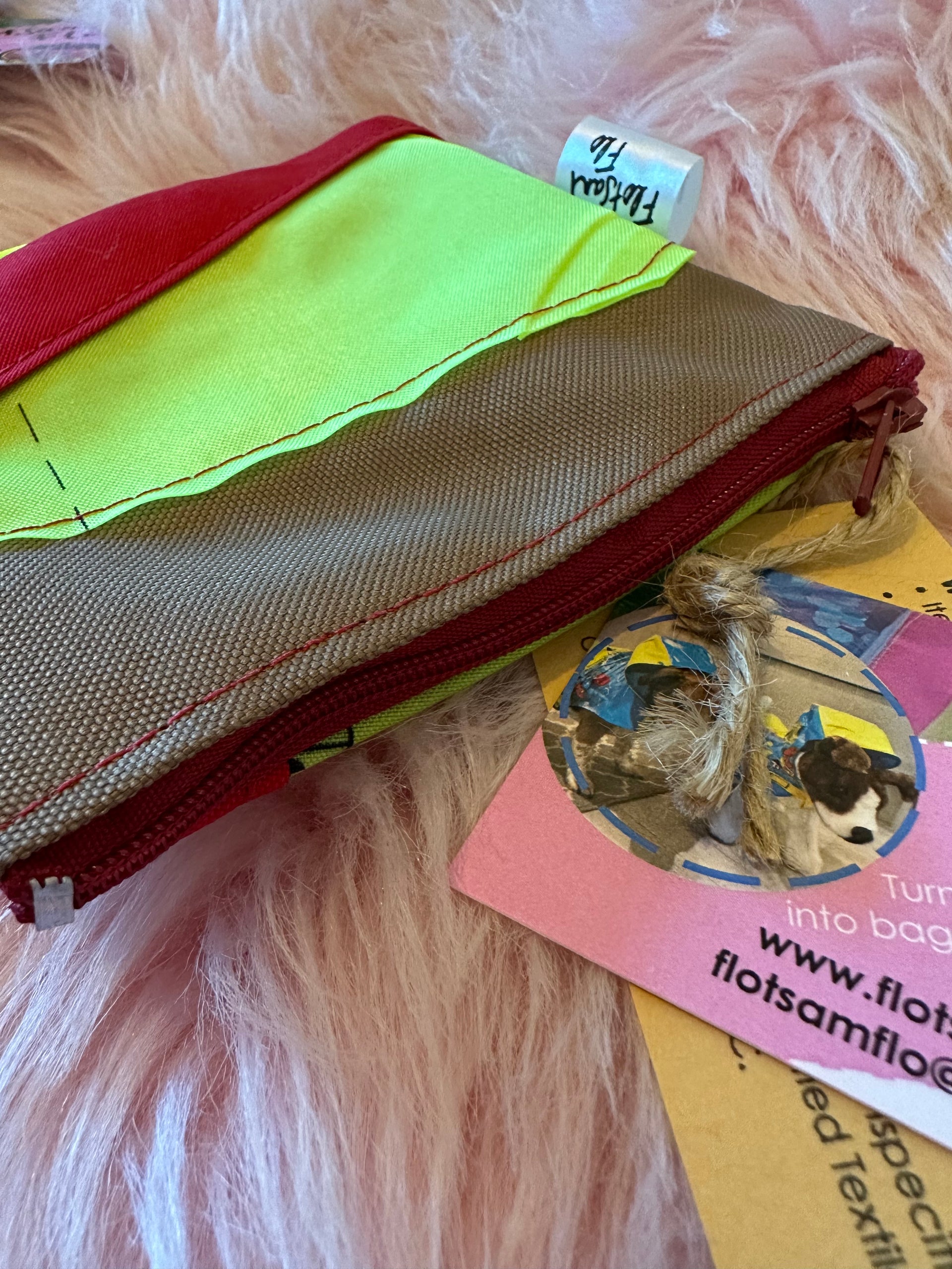 This zipped coin purse is handmade mostly from a decommissioned life jacket and Offcuts of other material, these materials cannot easily be recycled. This purse is quirky as it includes offcuts of the life jacket material which has been stitched ontop as decoration. The grey/beige material is the offcuts, the red and yellow material is the life jacket material. This item has been handmade in Cornwall.