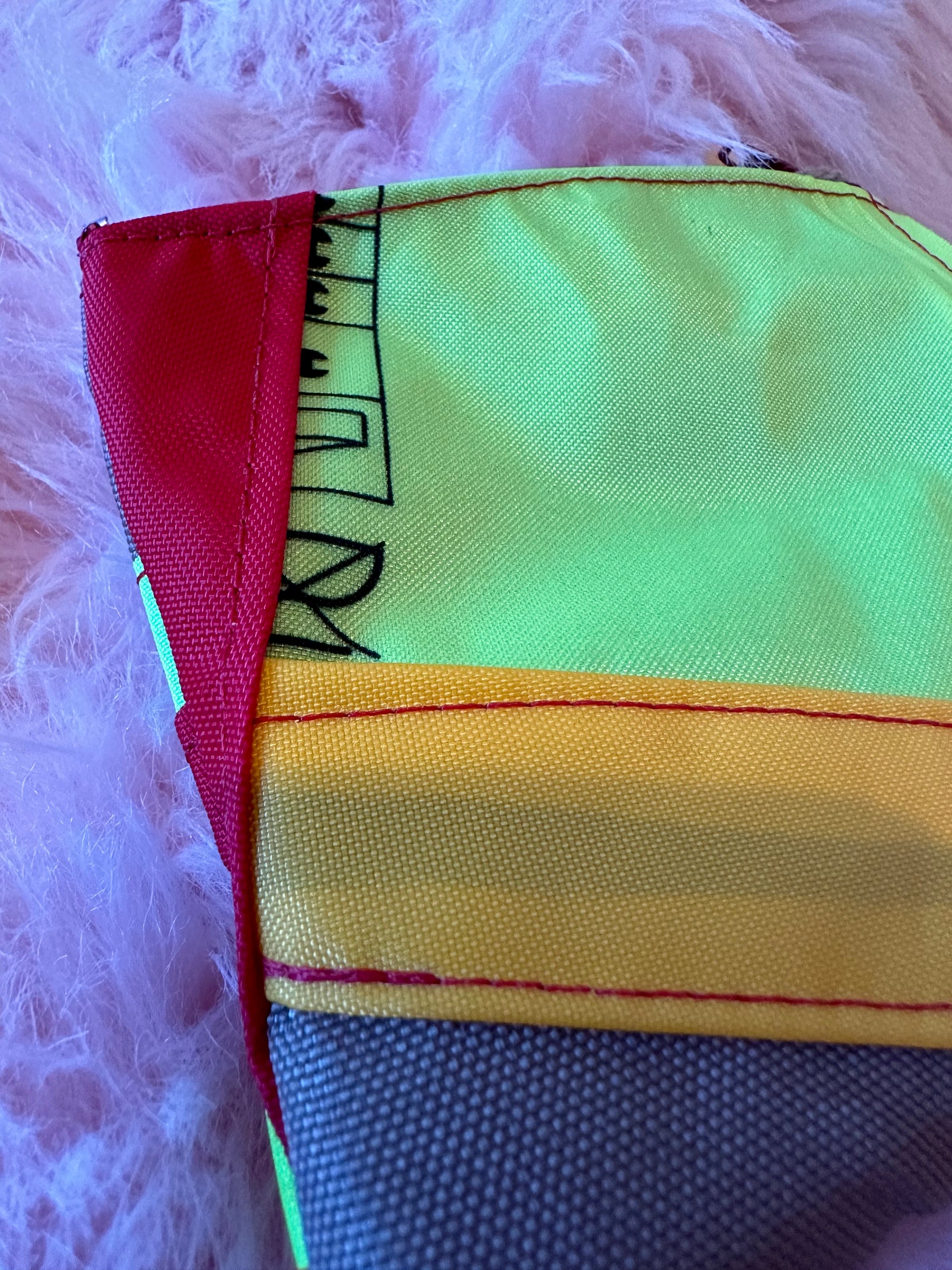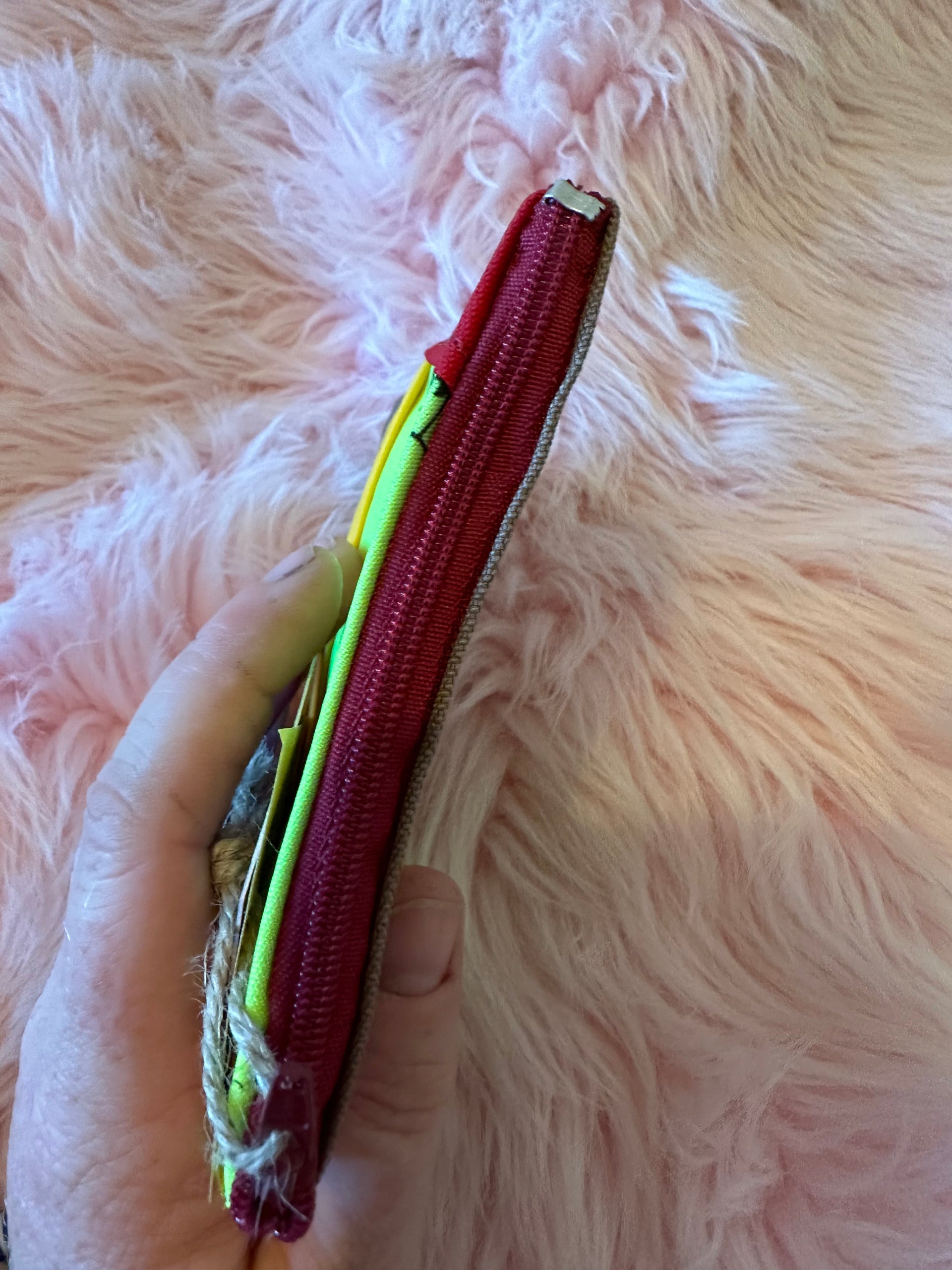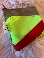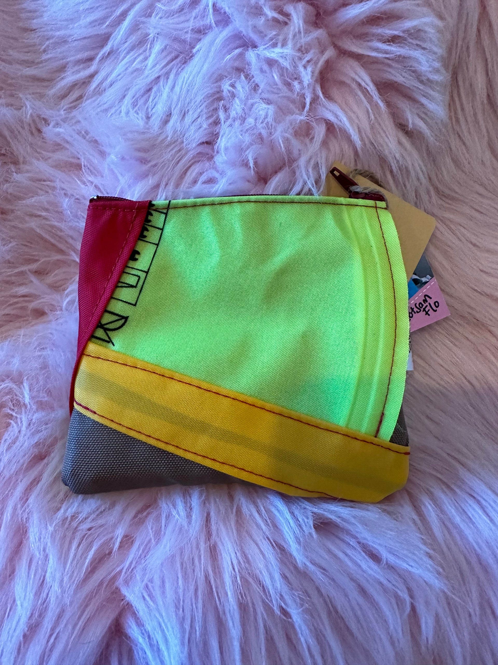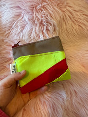 This zipped coin purse is handmade mostly from a decommissioned life jacket and Offcuts of other material, these materials cannot easily be recycled. This purse is quirky as it includes offcuts of the life jacket material which has been stitched ontop as decoration. The grey/beige material is the offcuts, the red and yellow material is the life jacket material. This item has been handmade in Cornwall.