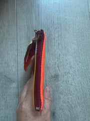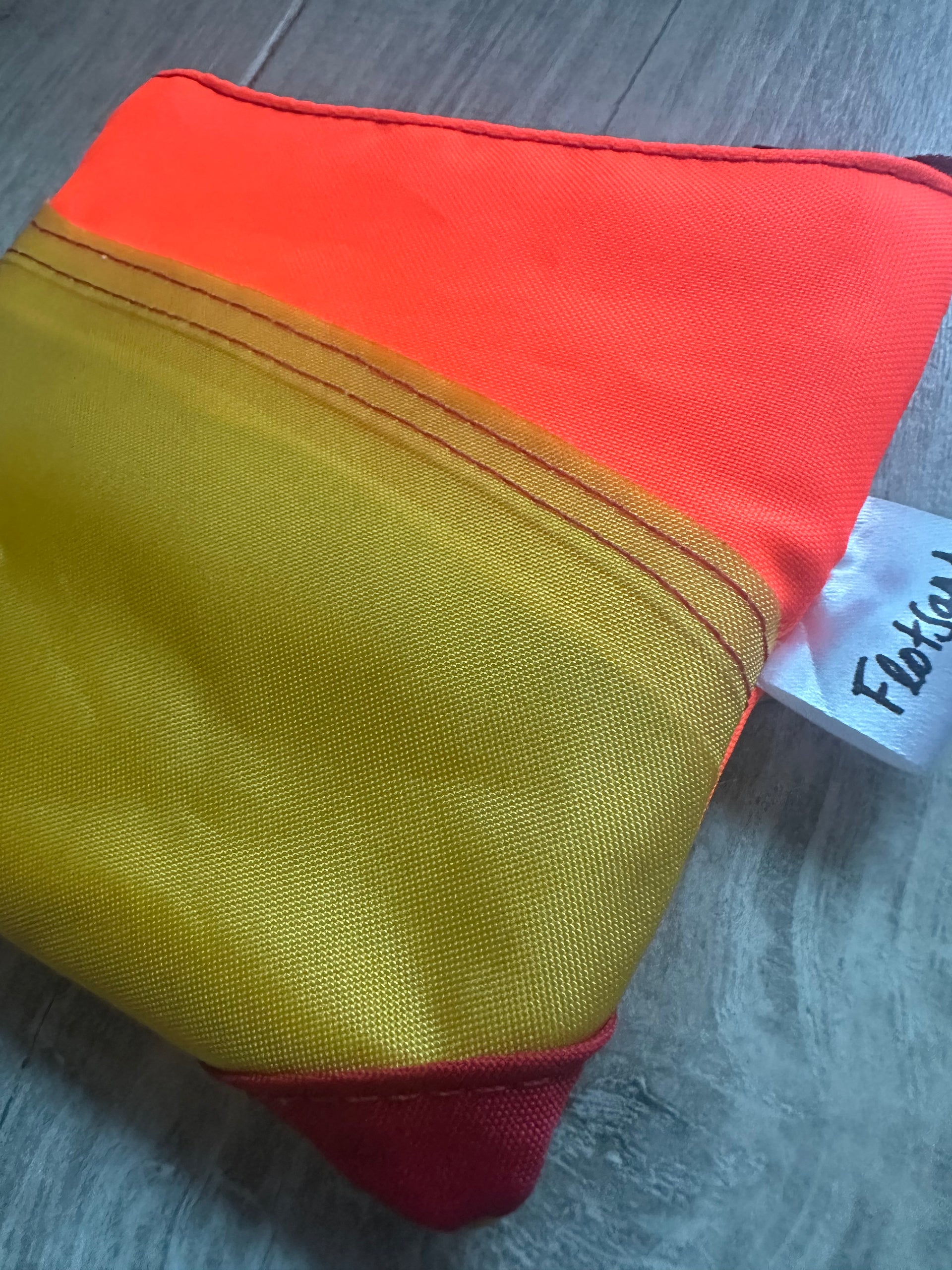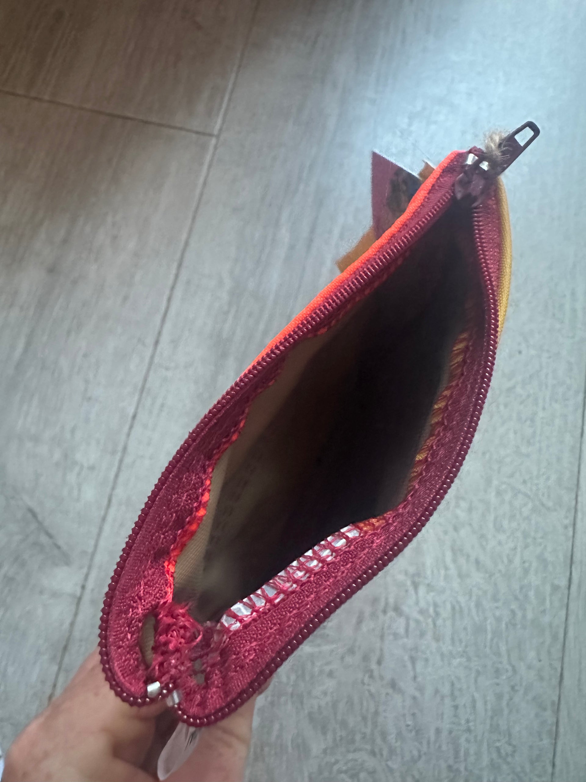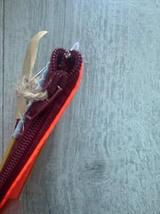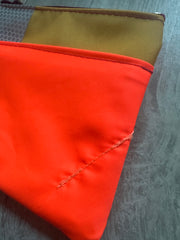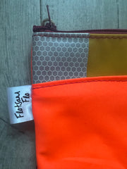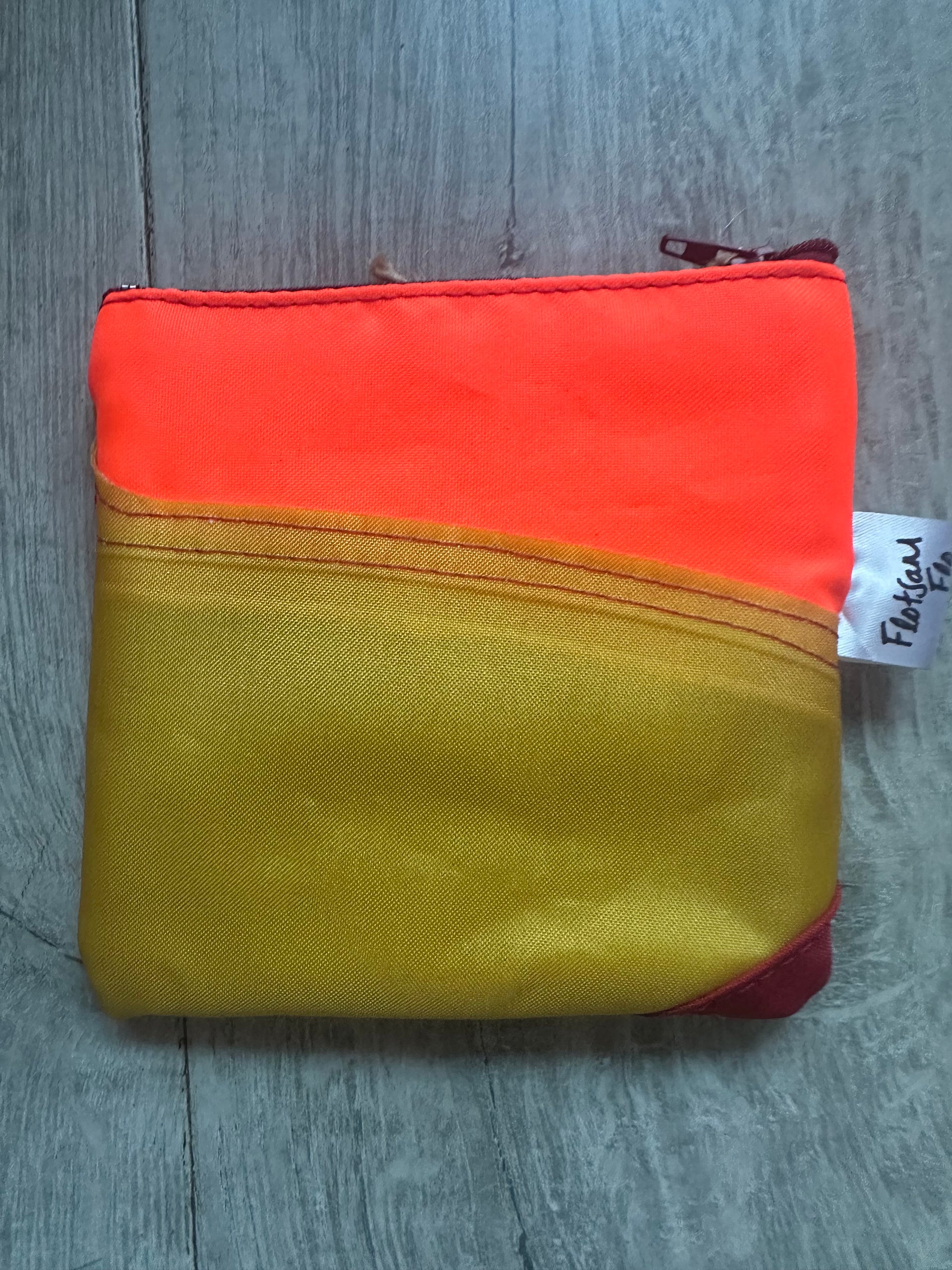 This zipped coin purse is handmade mostly from a life jacket and Offcuts of other material, these materials cannot easily be recycled. This purse is quirky as it includes offcuts of the life jacket material which has been stitched on top as decoration. The grey/beige material is the offcuts, the orange and yellow material is the life jacket material. This item has been handmade in Cornwall.