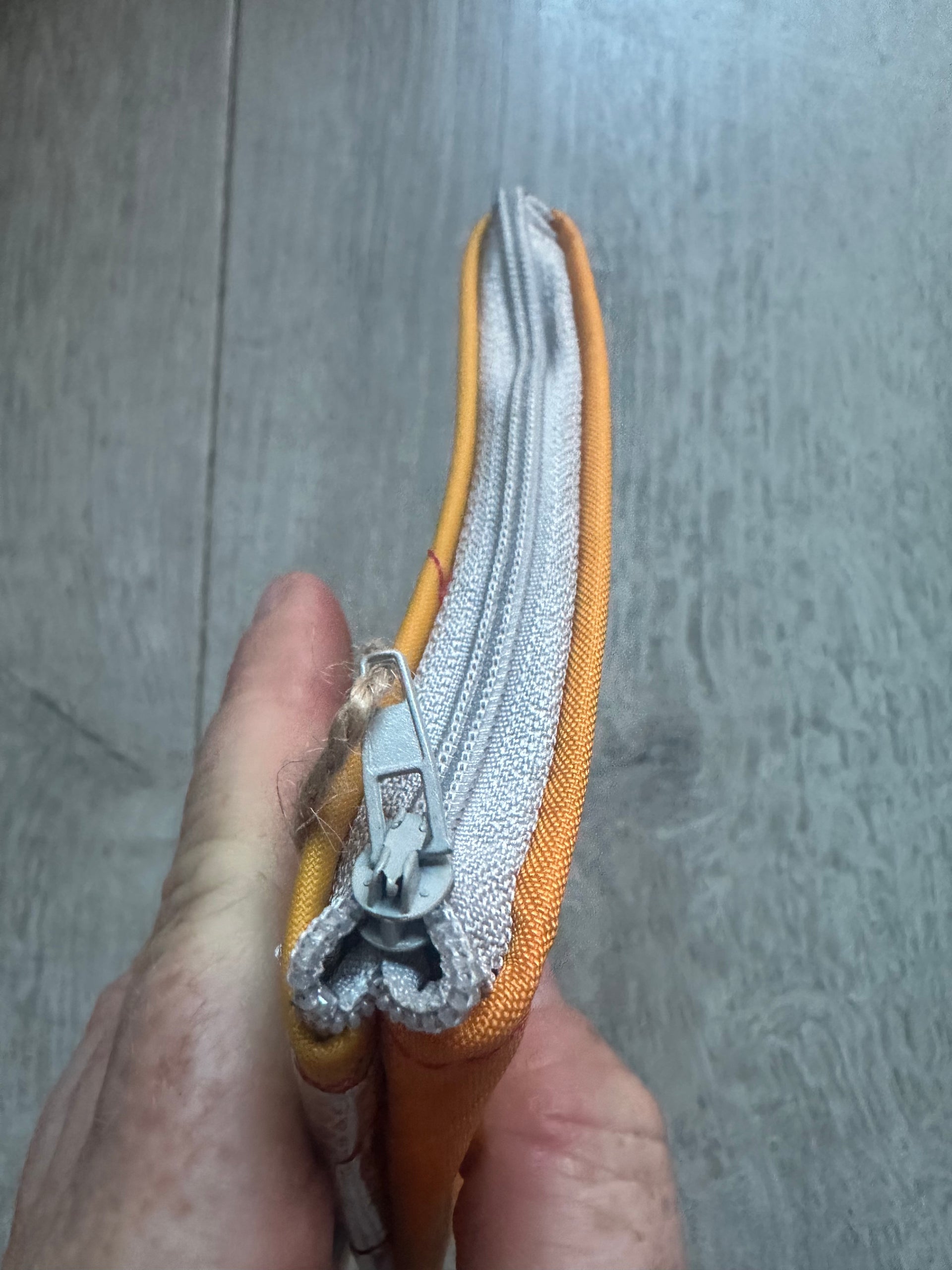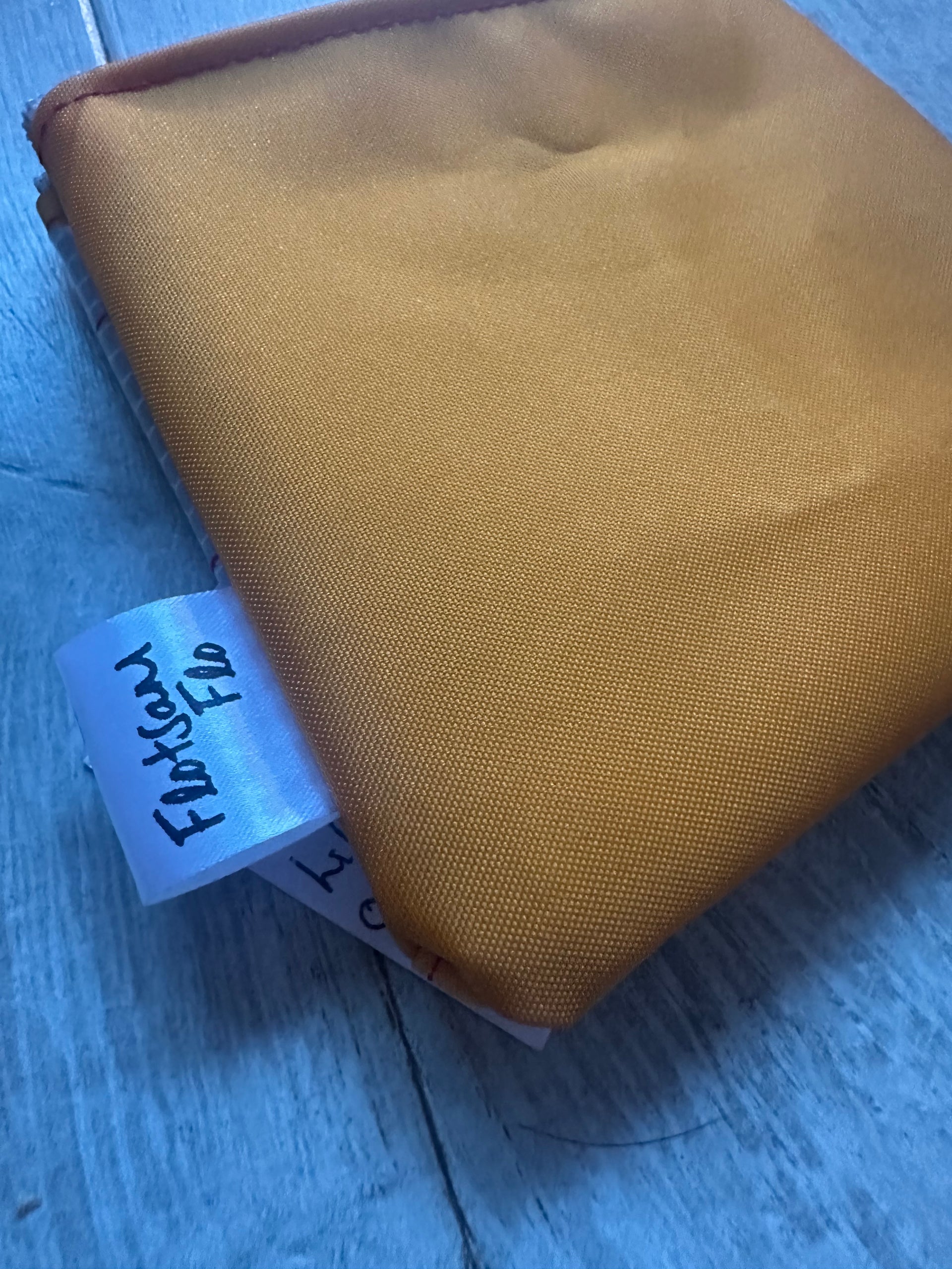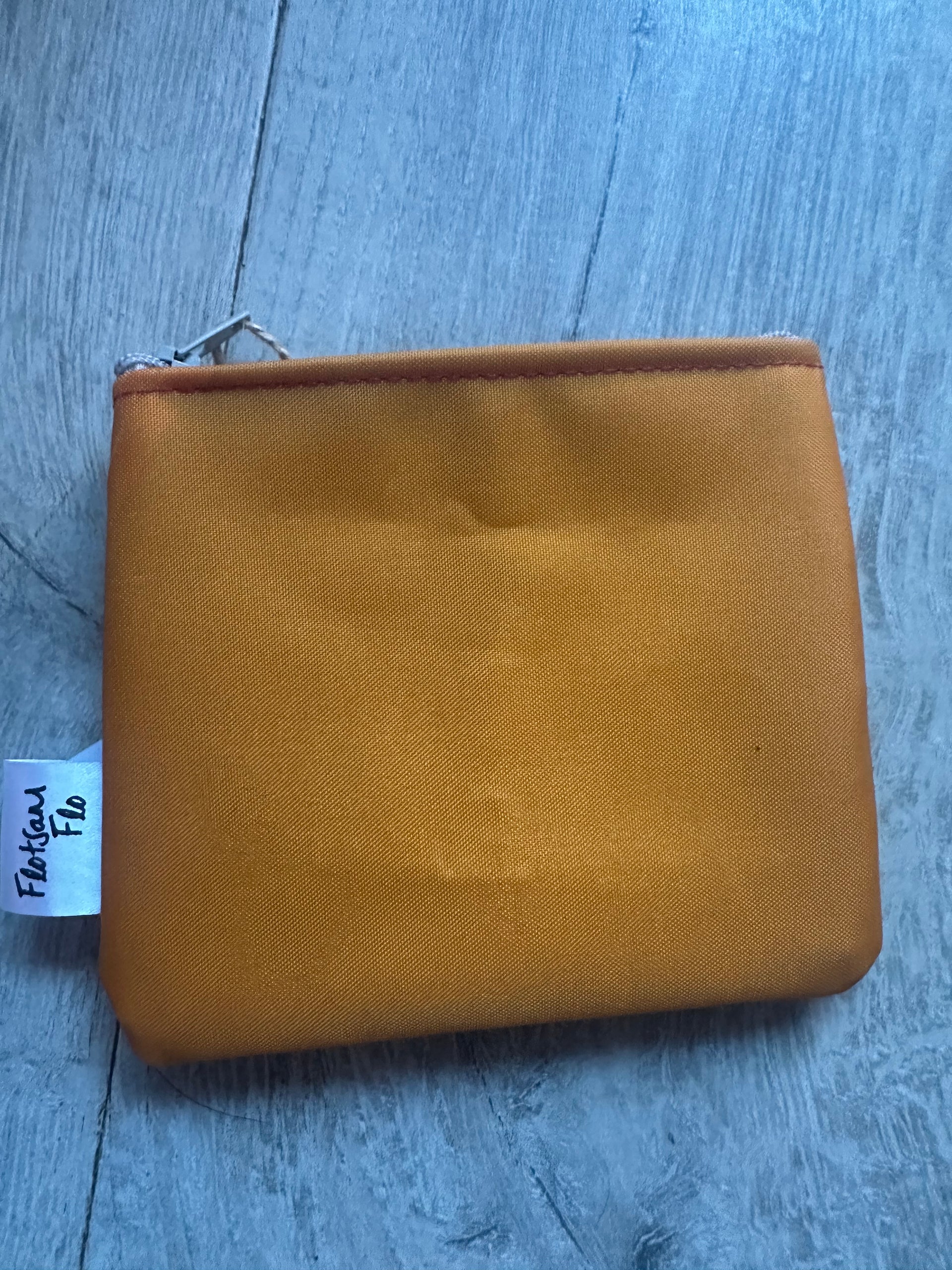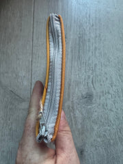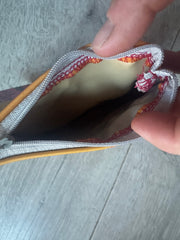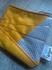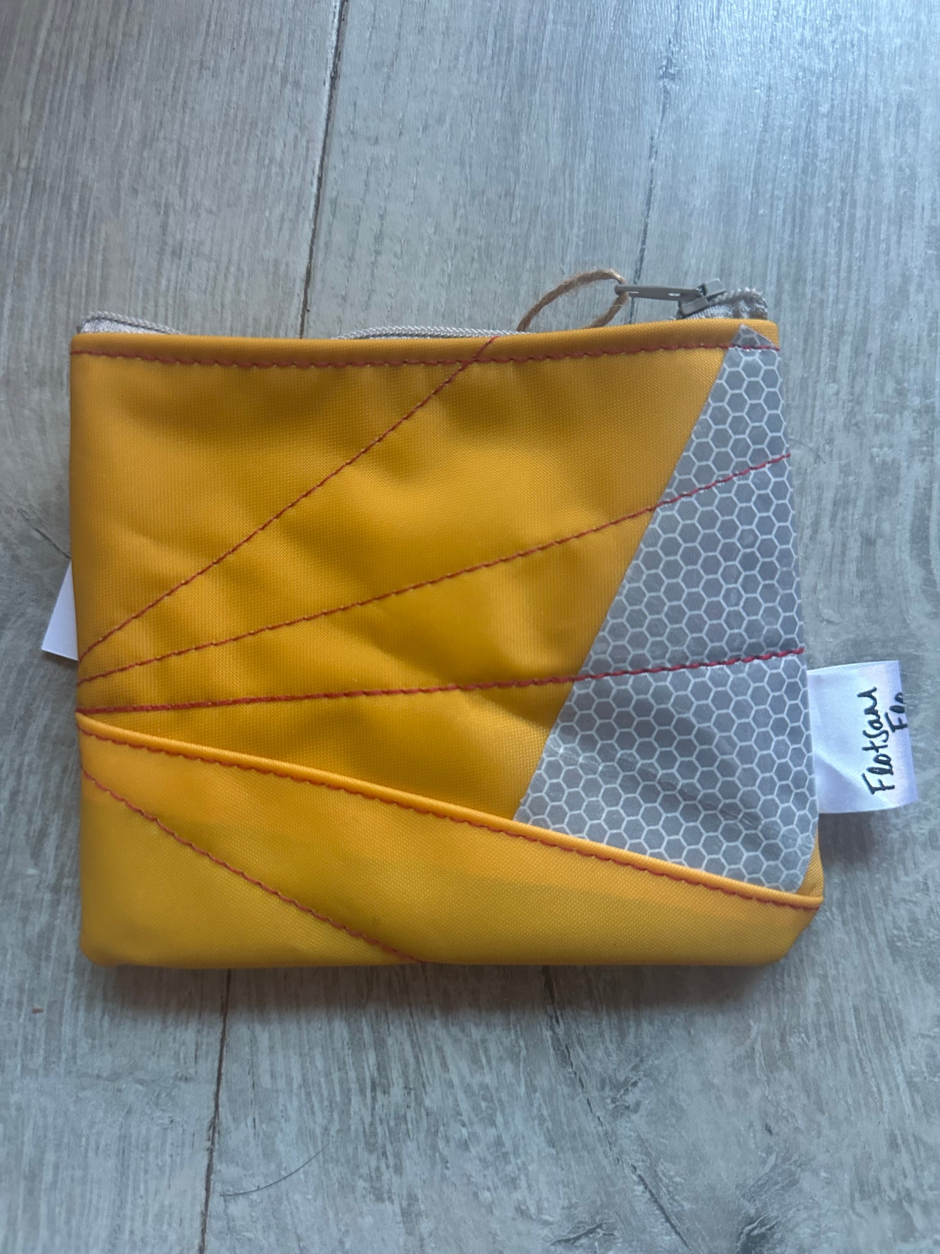 This zipped coin purse is handmade mostly from a life jacket and Offcuts of other material, these materials cannot easily be recycled. This purse is quirky as it includes offcuts of the life jacket material which has been stitched on top as decoration. The grey/beige material is the offcuts, the orange and yellow material is the life jacket material. This item has been handmade in Cornwall.