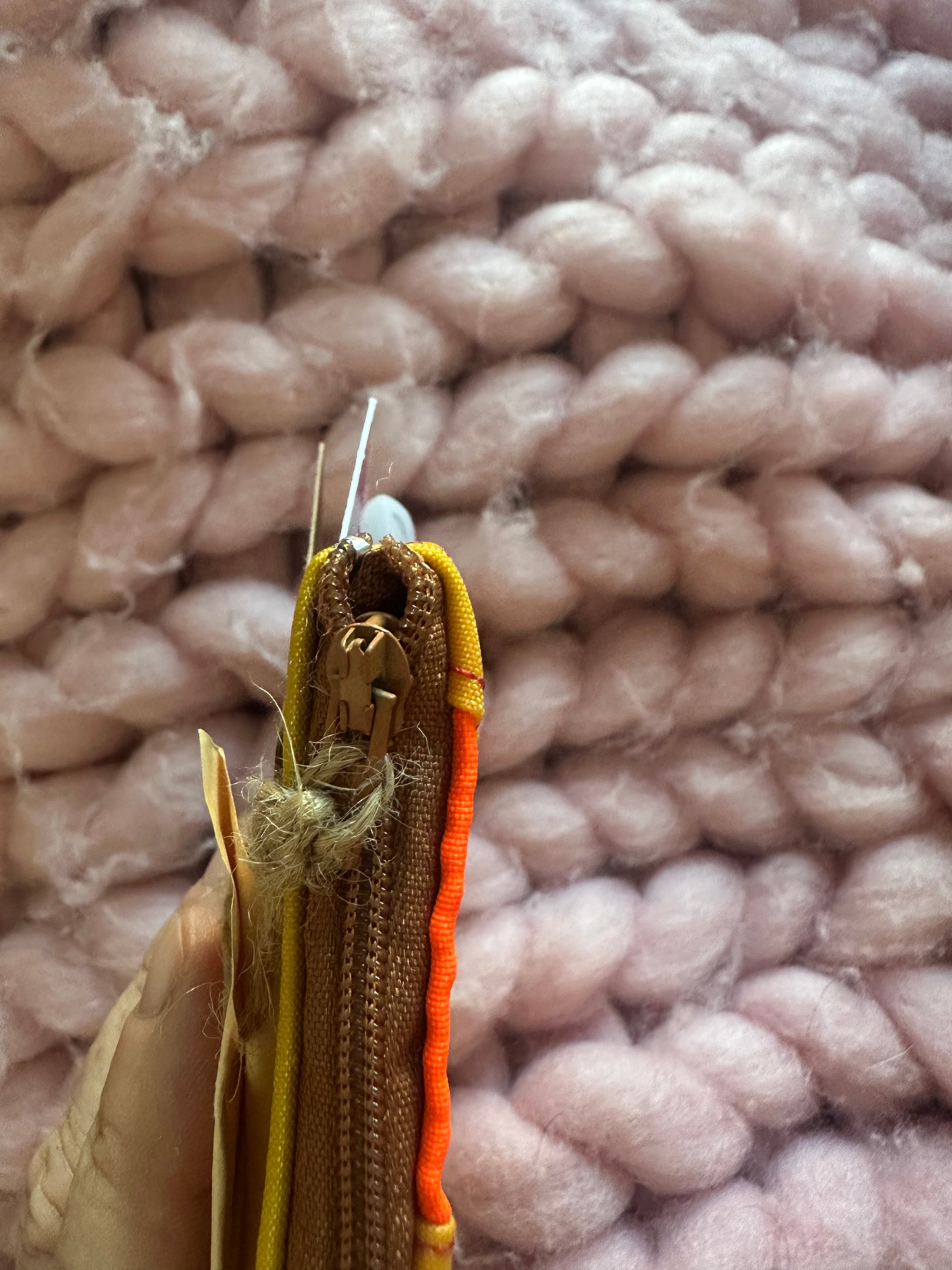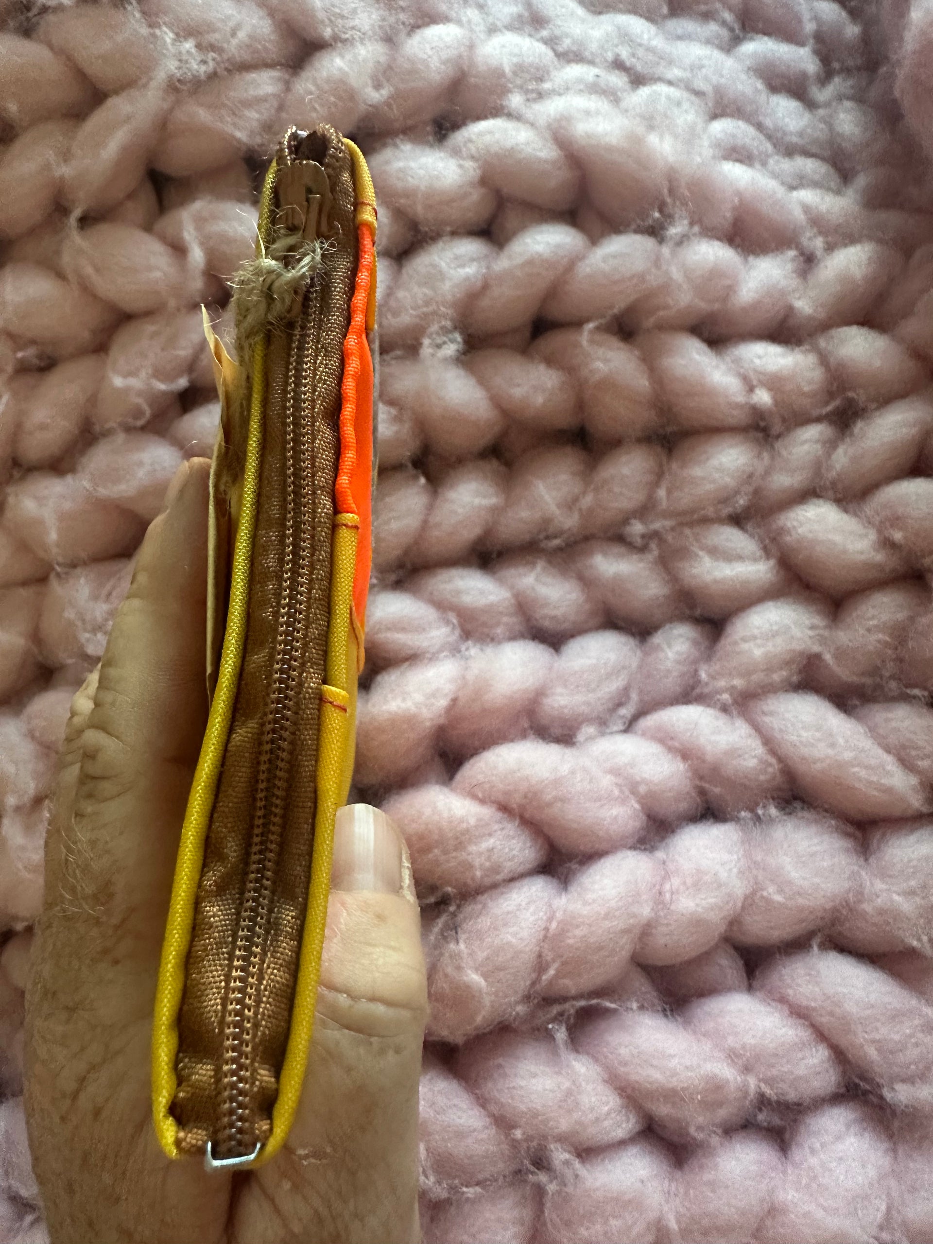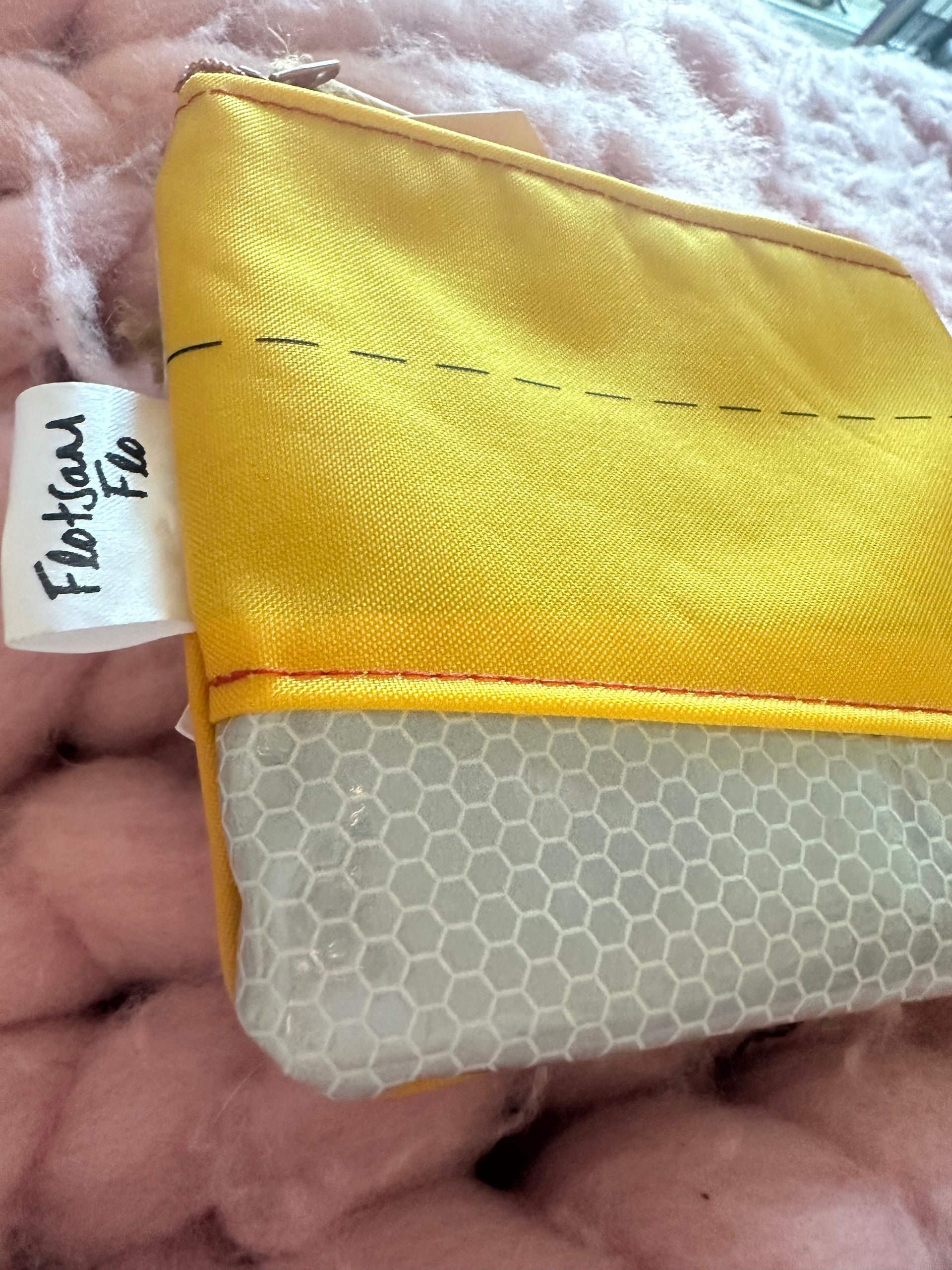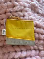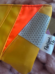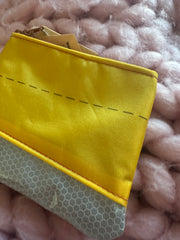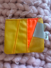 This zipped coin purse is handmade mostly from a life jacket and Offcuts of other material, these materials cannot easily be recycled. This purse is quirky as it includes offcuts of the life jacket material which has been stitched on top as decoration. The grey/beige material is the offcuts, the orange and yellow material is the life jacket material. This item has been handmade in Cornwall.