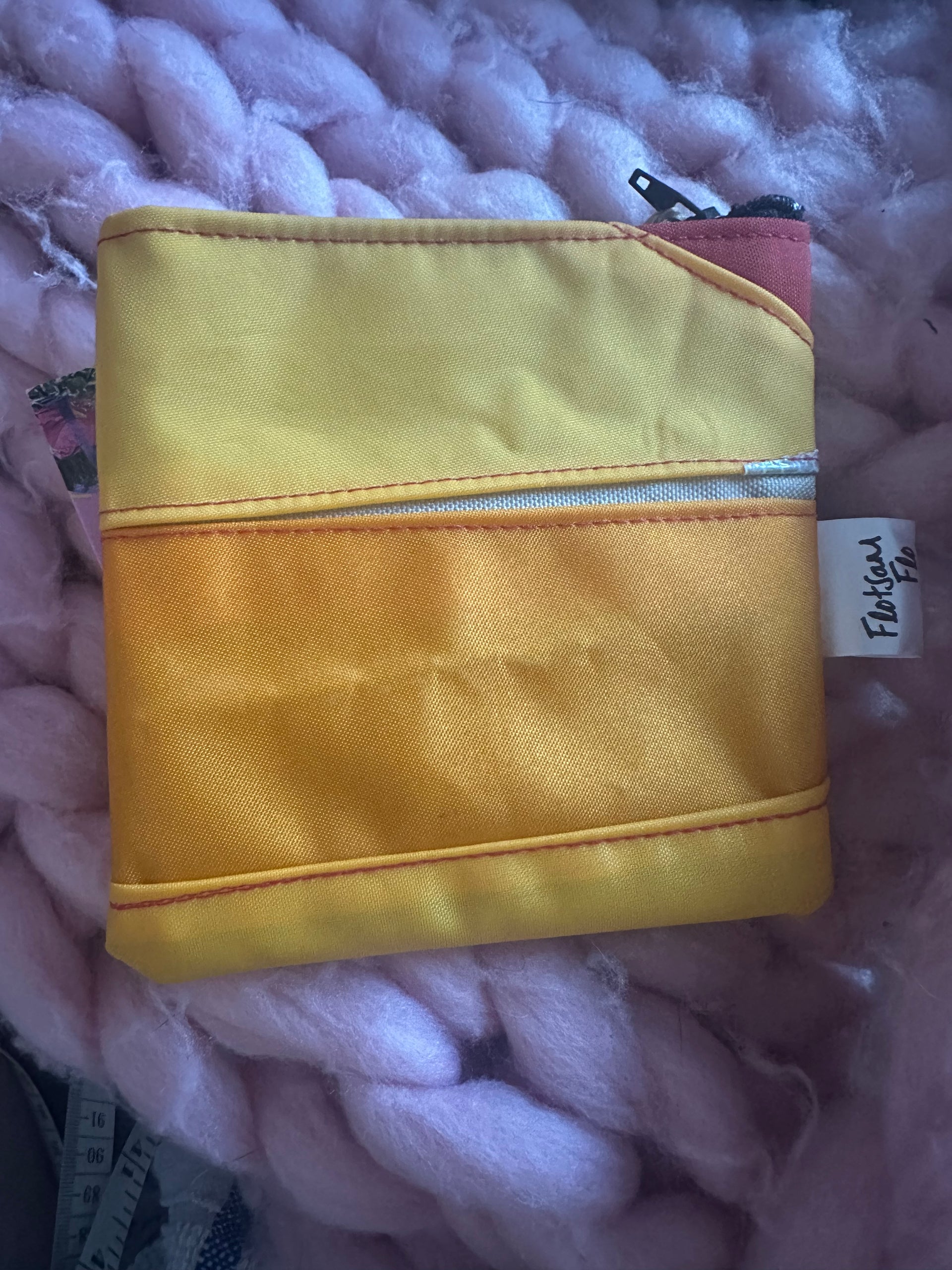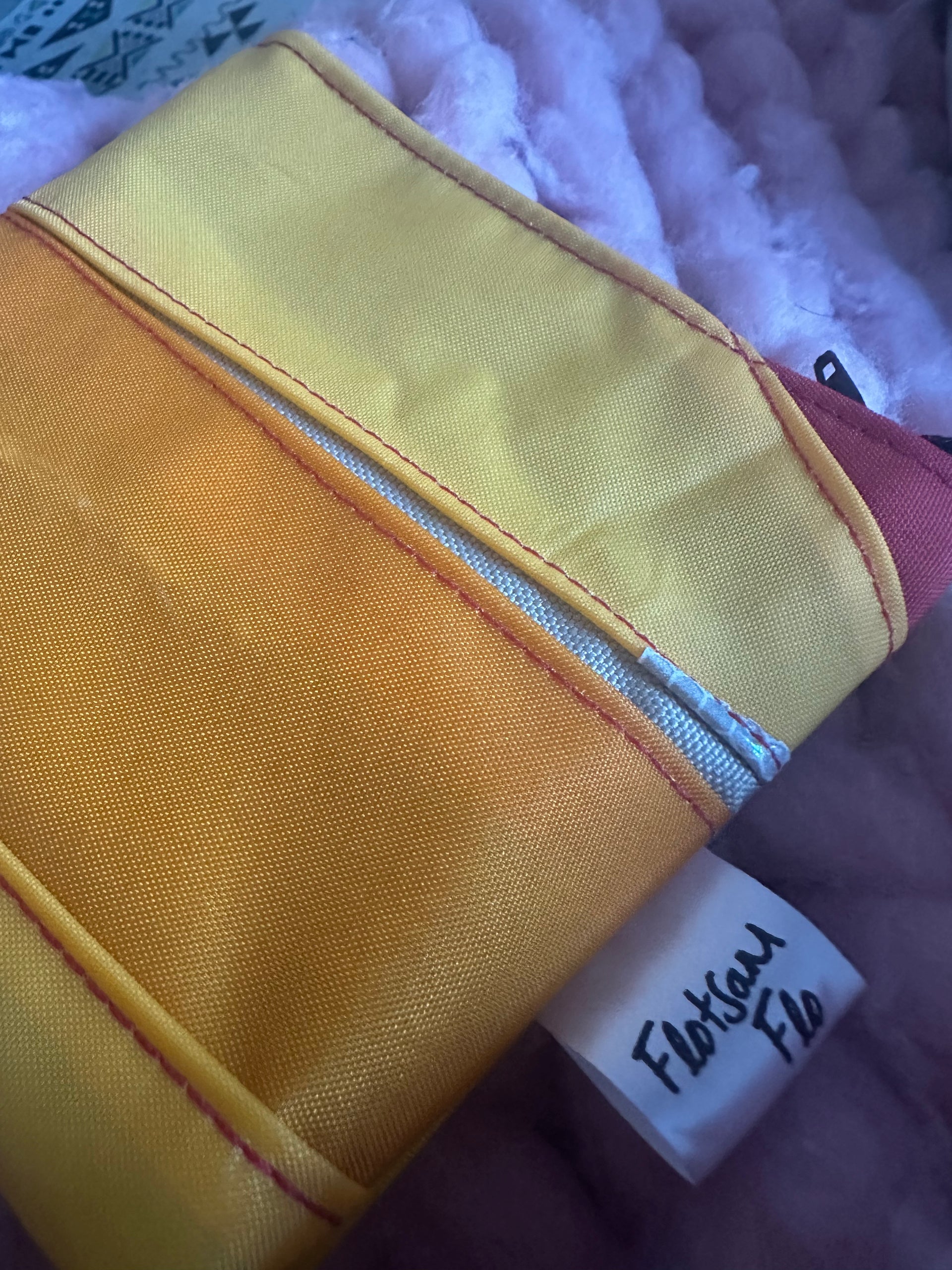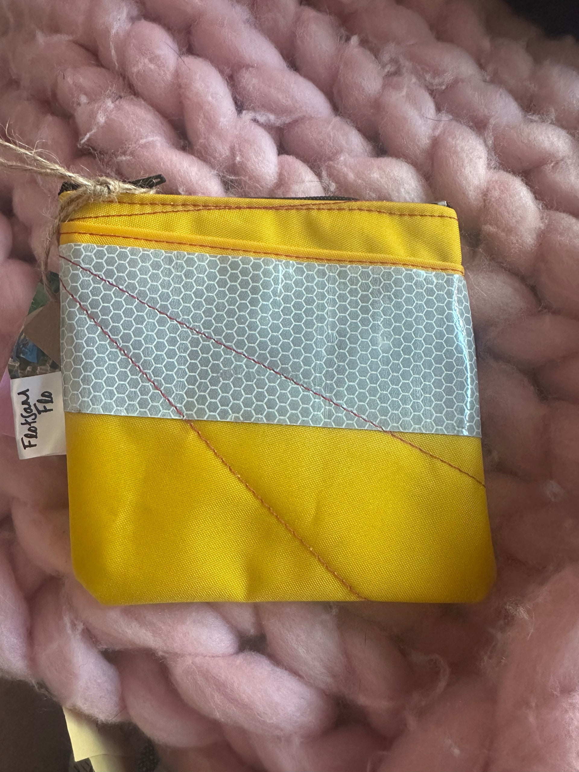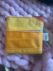 This zipped coin purse is handmade mostly from a life jacket and Offcuts of other material, these materials cannot easily be recycled. This purse is quirky as it includes offcuts of the life jacket material which has been stitched on top as decoration. The grey/beige material is the offcuts, the orange and yellow material is the life jacket material. This item has been handmade in Cornwall.