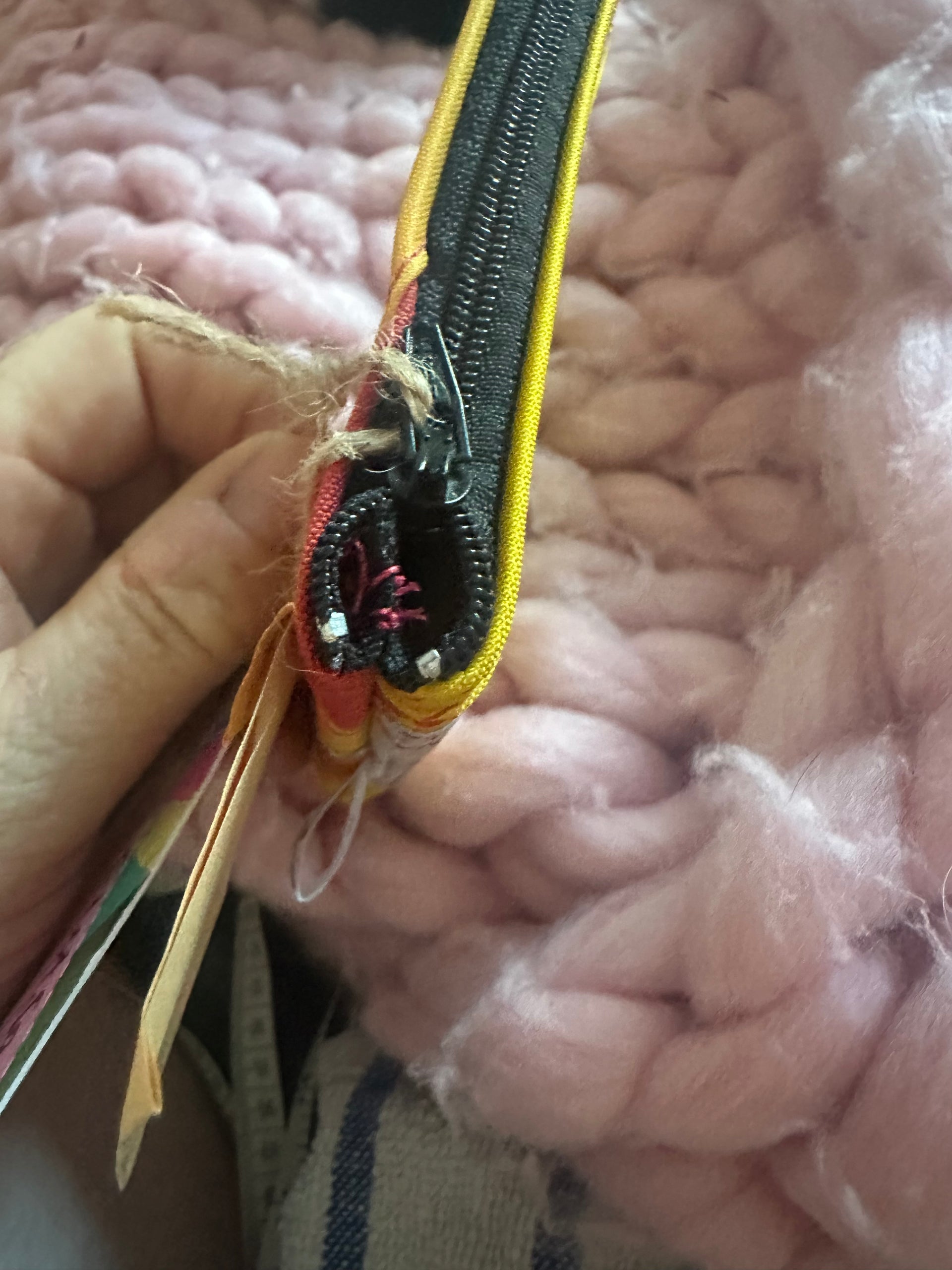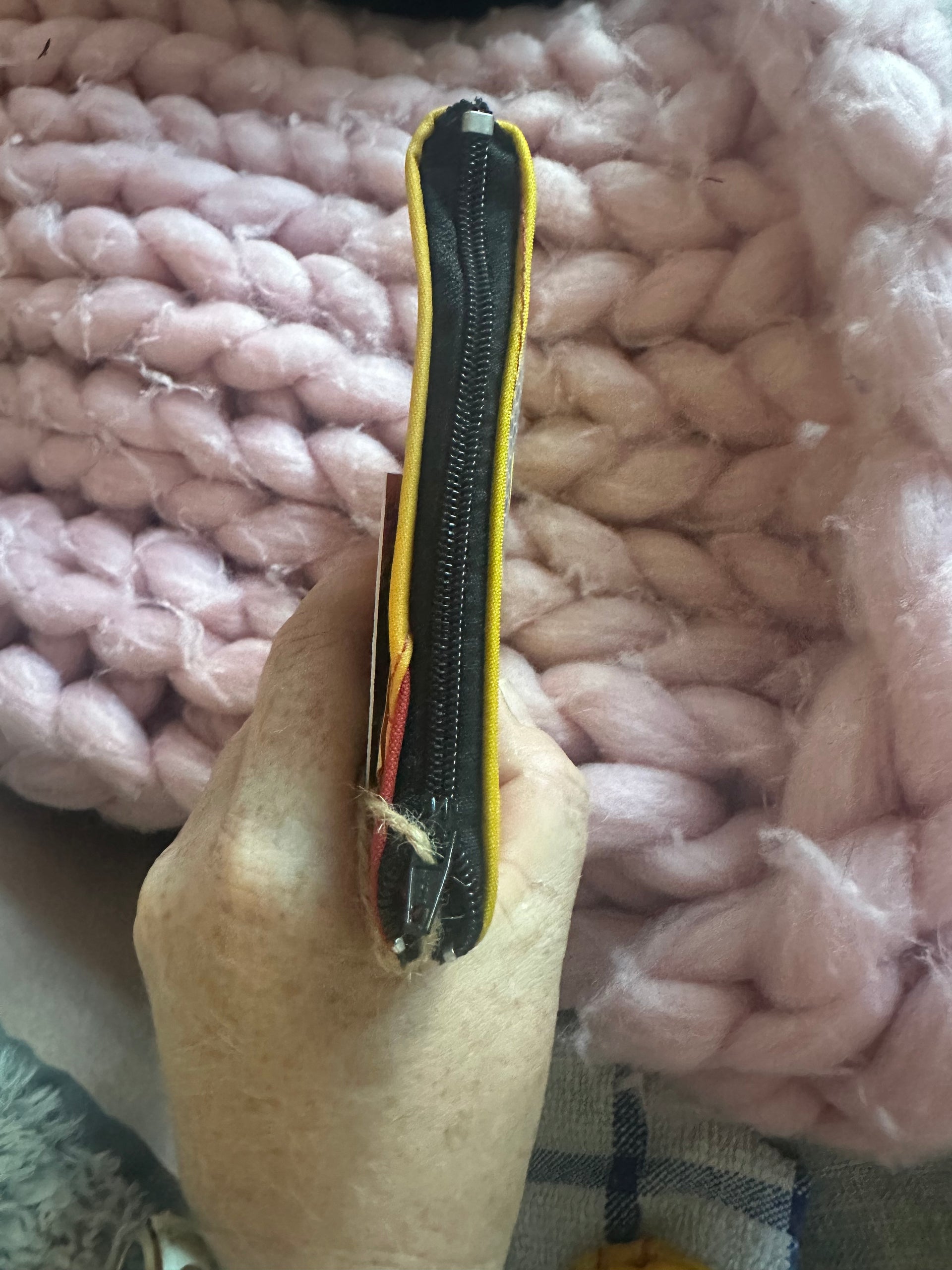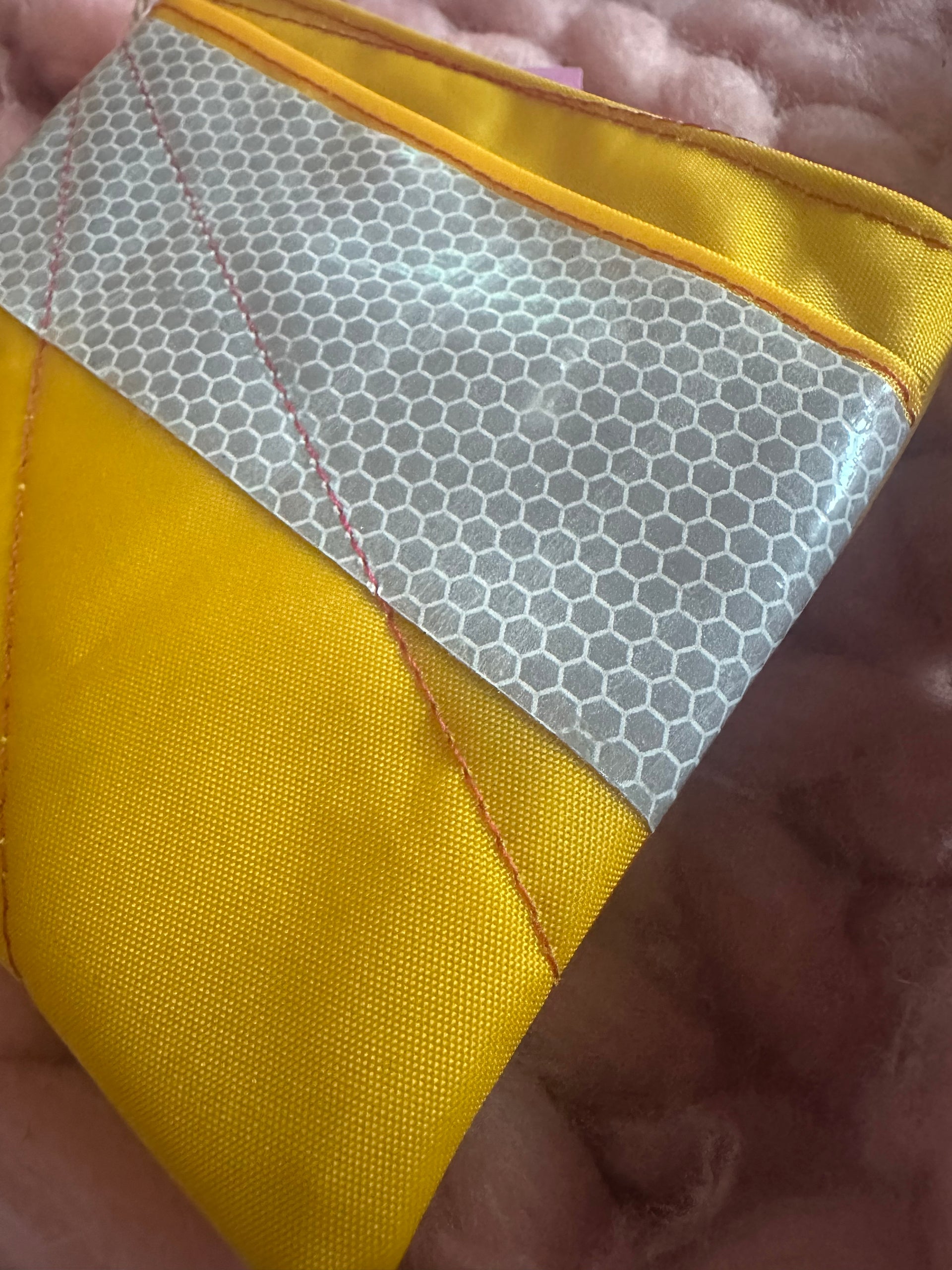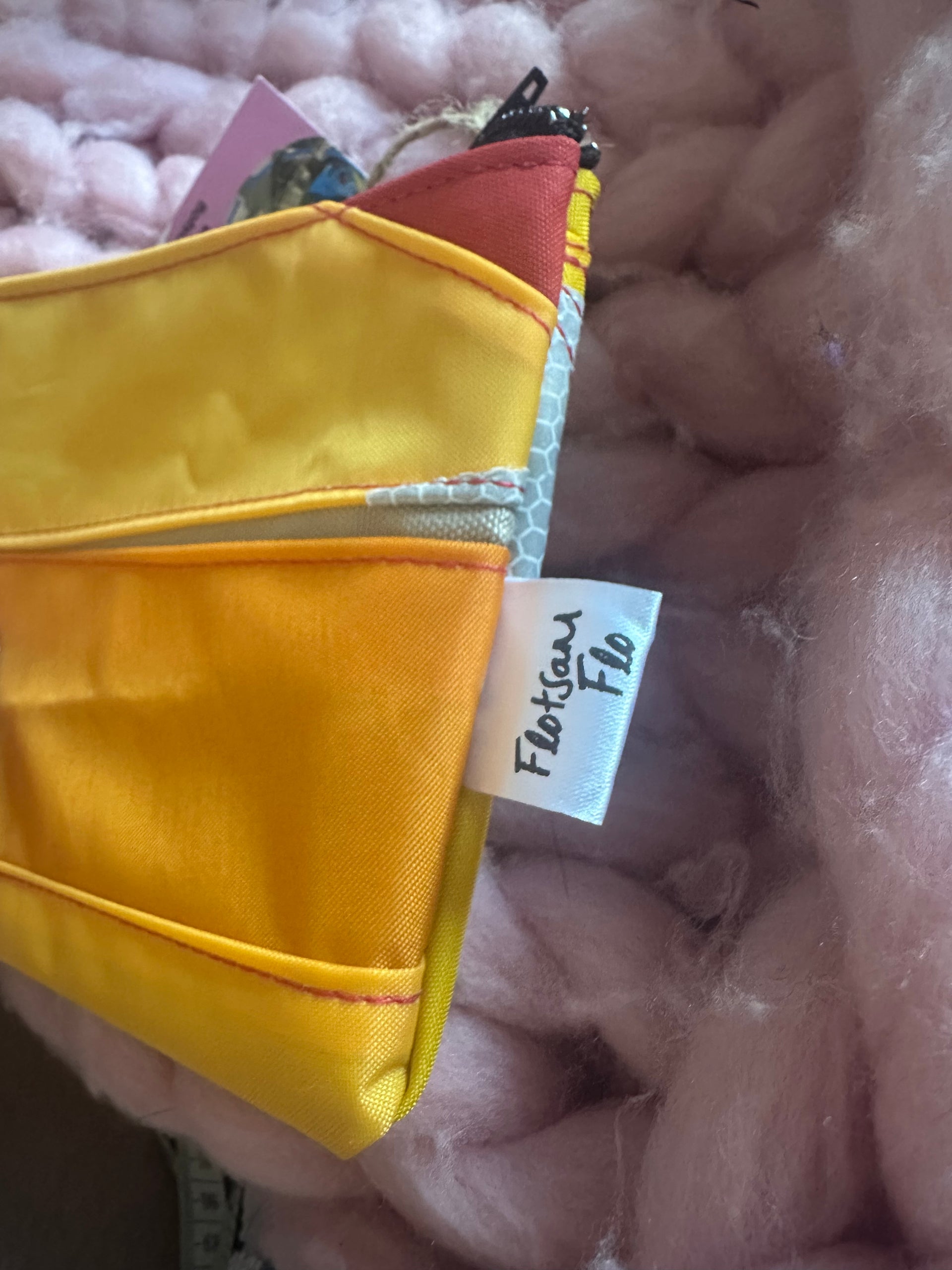 This zipped coin purse is handmade mostly from a life jacket and Offcuts of other material, these materials cannot easily be recycled. This purse is quirky as it includes offcuts of the life jacket material which has been stitched on top as decoration. The grey/beige material is the offcuts, the orange and yellow material is the life jacket material. This item has been handmade in Cornwall.